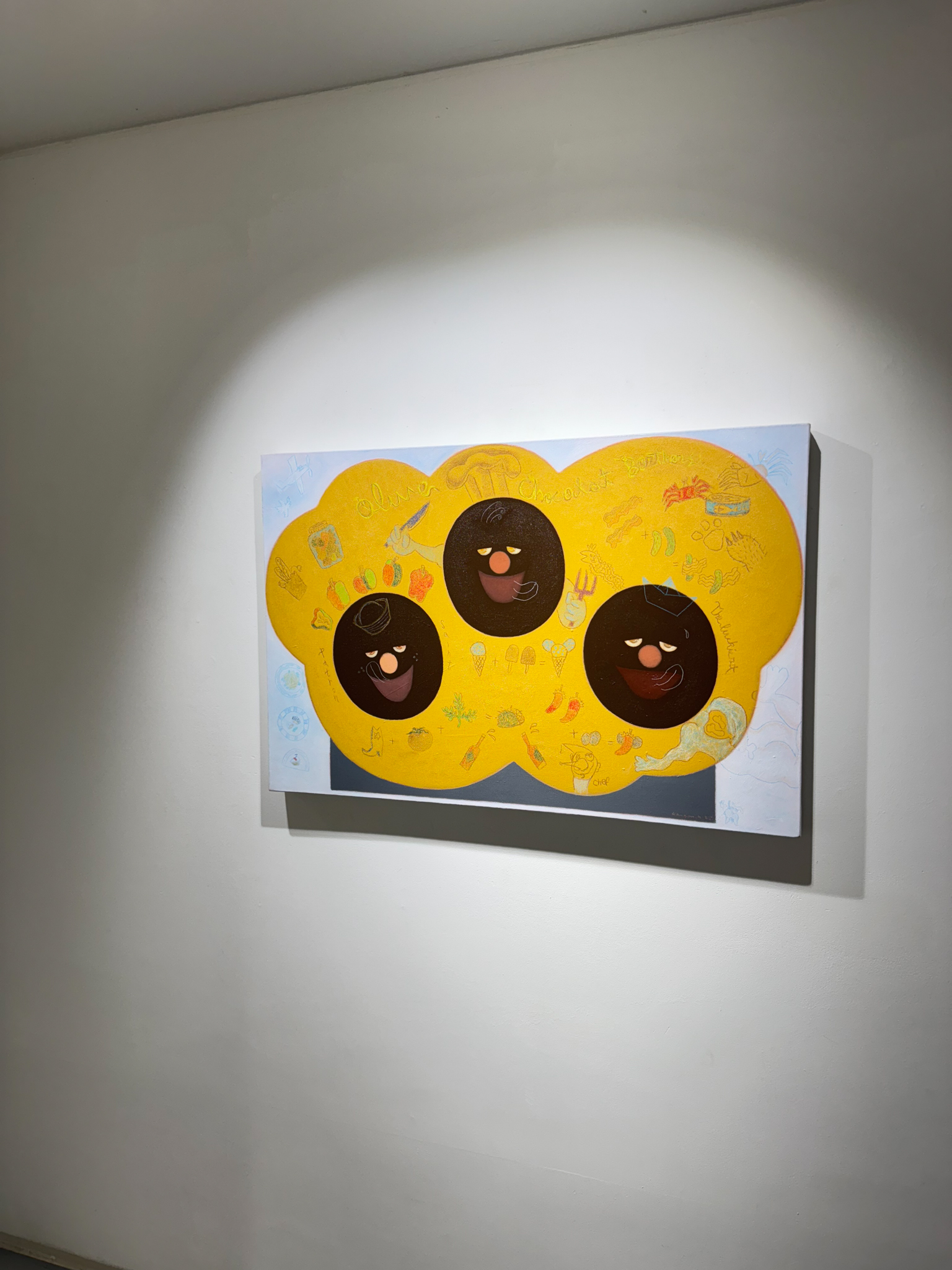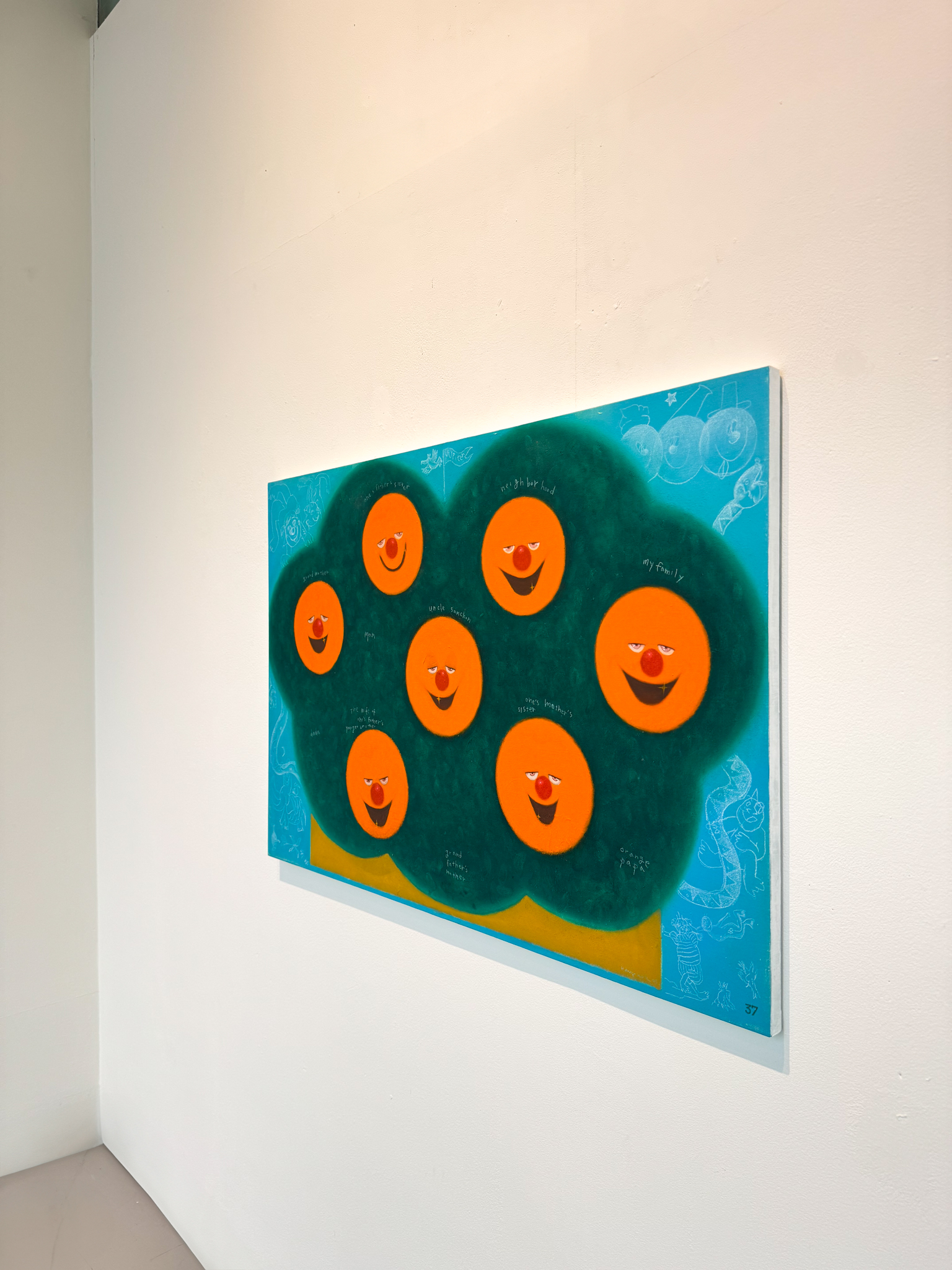 작가는 어린 시절에 보고 느낀 경험을 캔버스 화면 속에서 현실과 이상을 오가며 작가 특유의 유머와 밝음을 담아 일기를 쓰듯 드로잉 한다. 그리고 잊고 있었던 순간을 기억하고 사랑하는 사람들과의 관계 속에서 꿈꾸는 그만의 세계를 그려간다. 마치 나무 속 주렁주렁 달린 열매들은 우주에서 빛나는 행성들과 같이 가족, 친구, 연인과 같은 관계하는 이들의 모습을 담아낸다. 열매 안에 사실적으로 표현한 눈은 수호신과 같은 존재이다. 간혹 짓궂어지기도 하지만 늘 우리 곁을 지켜주는 에너지의 원천인 가족을 생각하며 수호신으로 표현하였다.