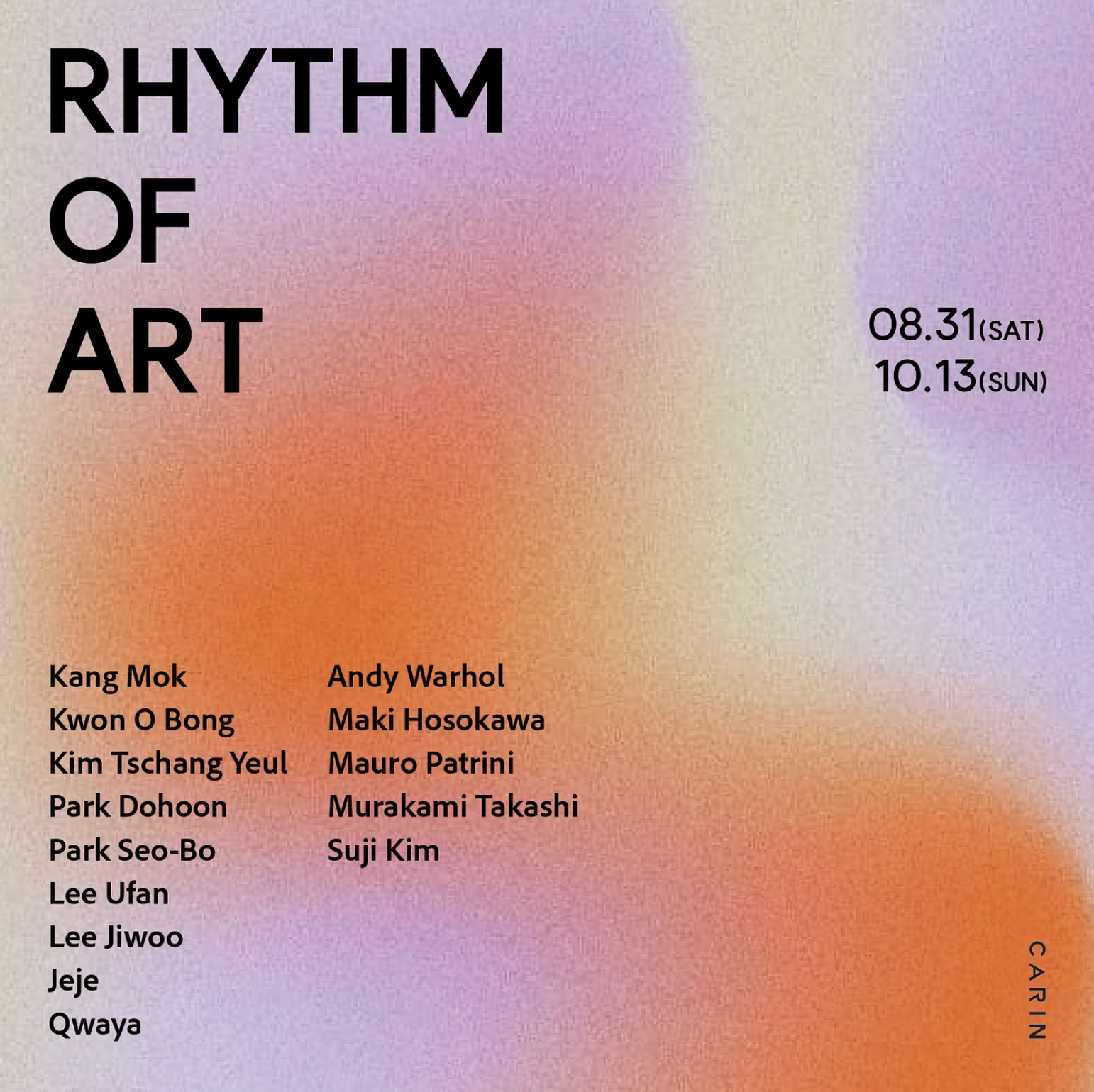 Kang Mok 강목 ㅣ Kwon O Bong 권오봉 ㅣ Kim Tschang Yeul 김창열 ㅣ Park Dohoon 박도훈 ㅣ Park Seo-Bo 박서보 ㅣ Lee Ufan 이우환 ㅣ Lee Jiwoo 이지우 ㅣ Jeje 제제 ㅣ Qwaya 콰야 ㅣ Andy Warhol 앤디 워홀 ㅣ Maki Hosokawa 마키 호소카와 ㅣ Mauro Patrini 마우로 파트리니