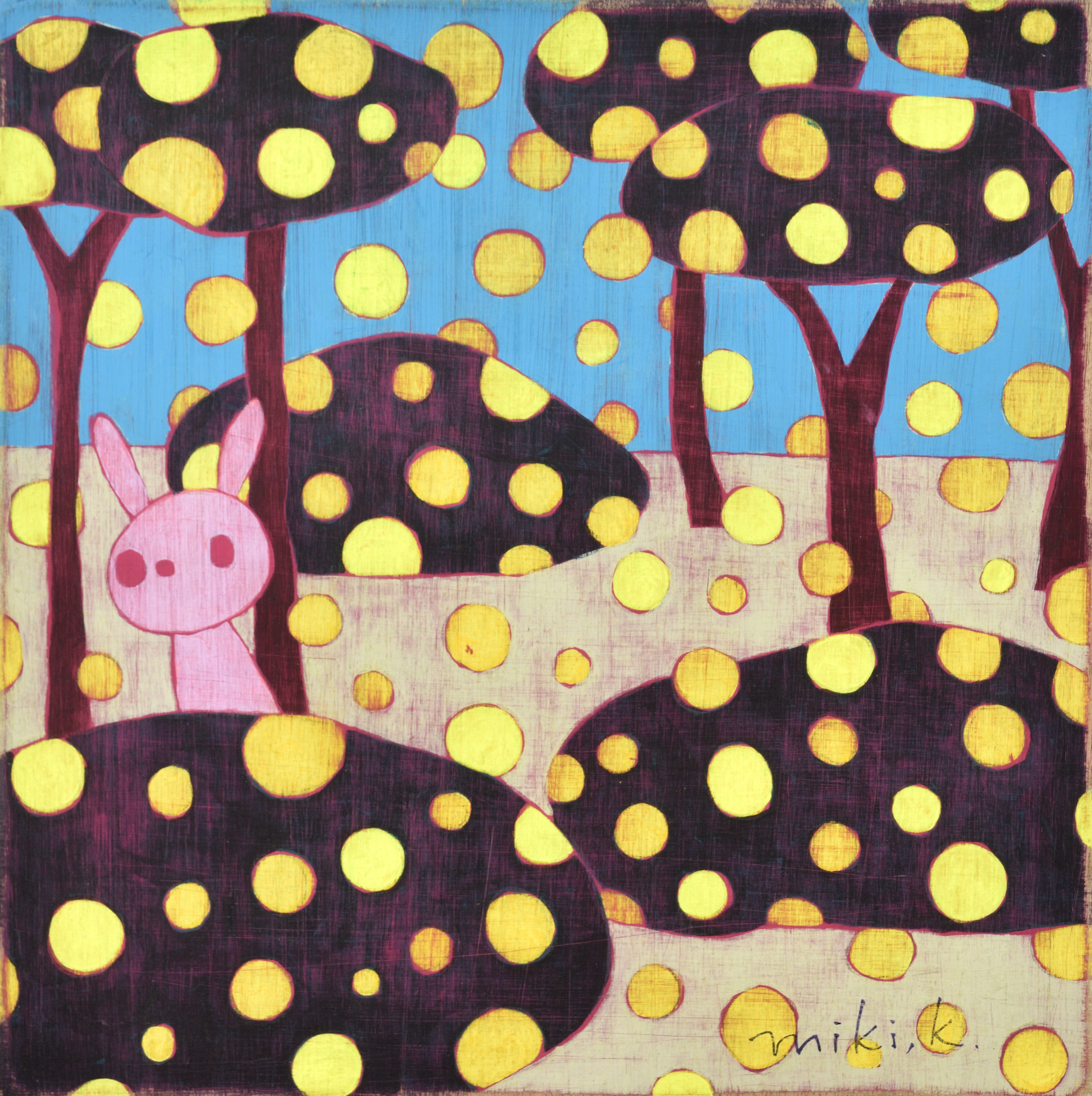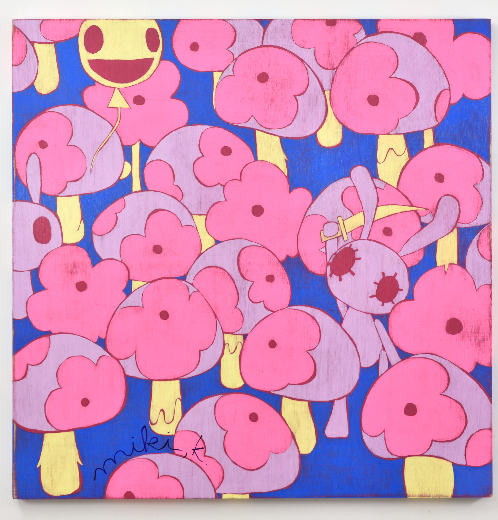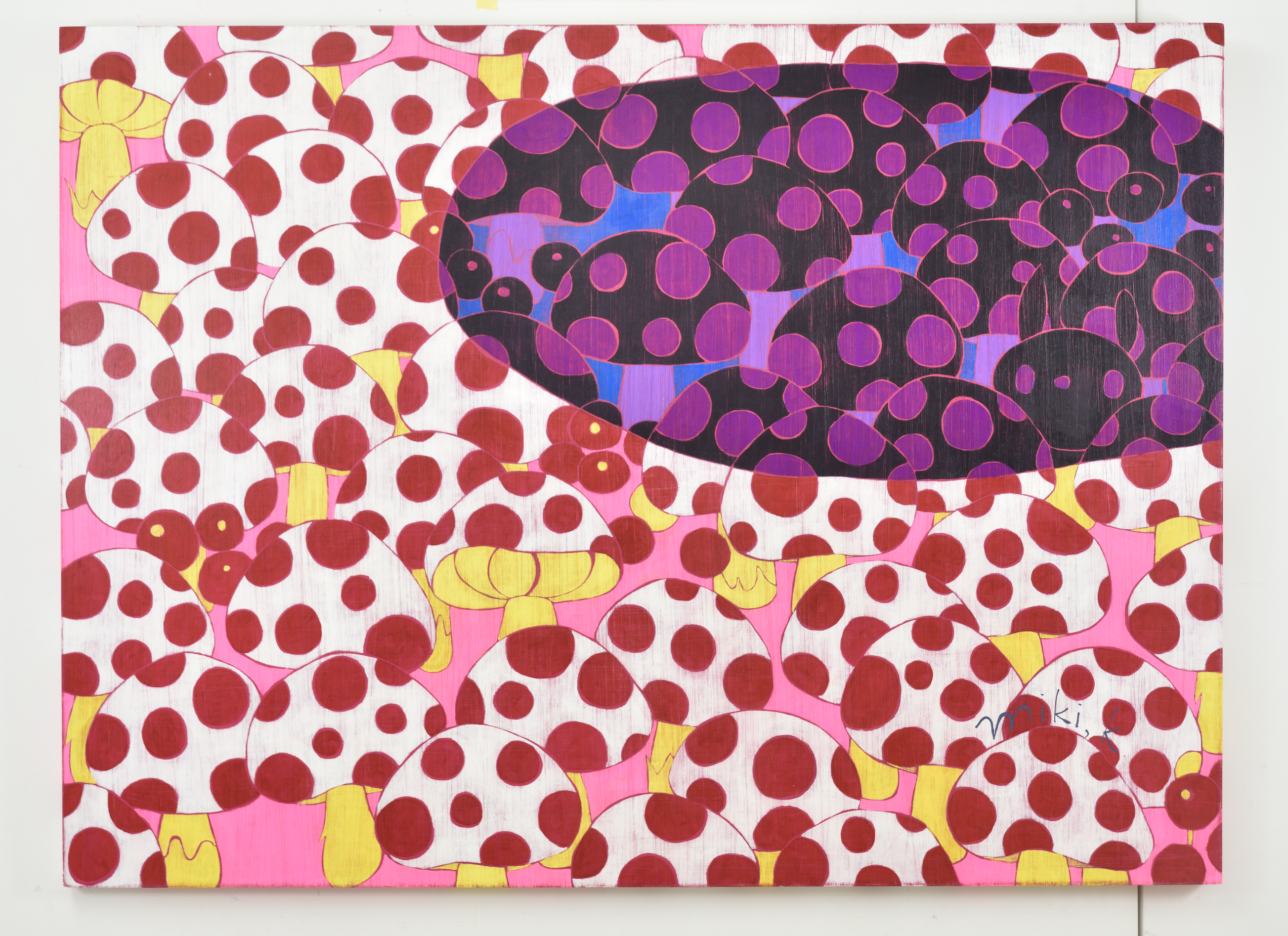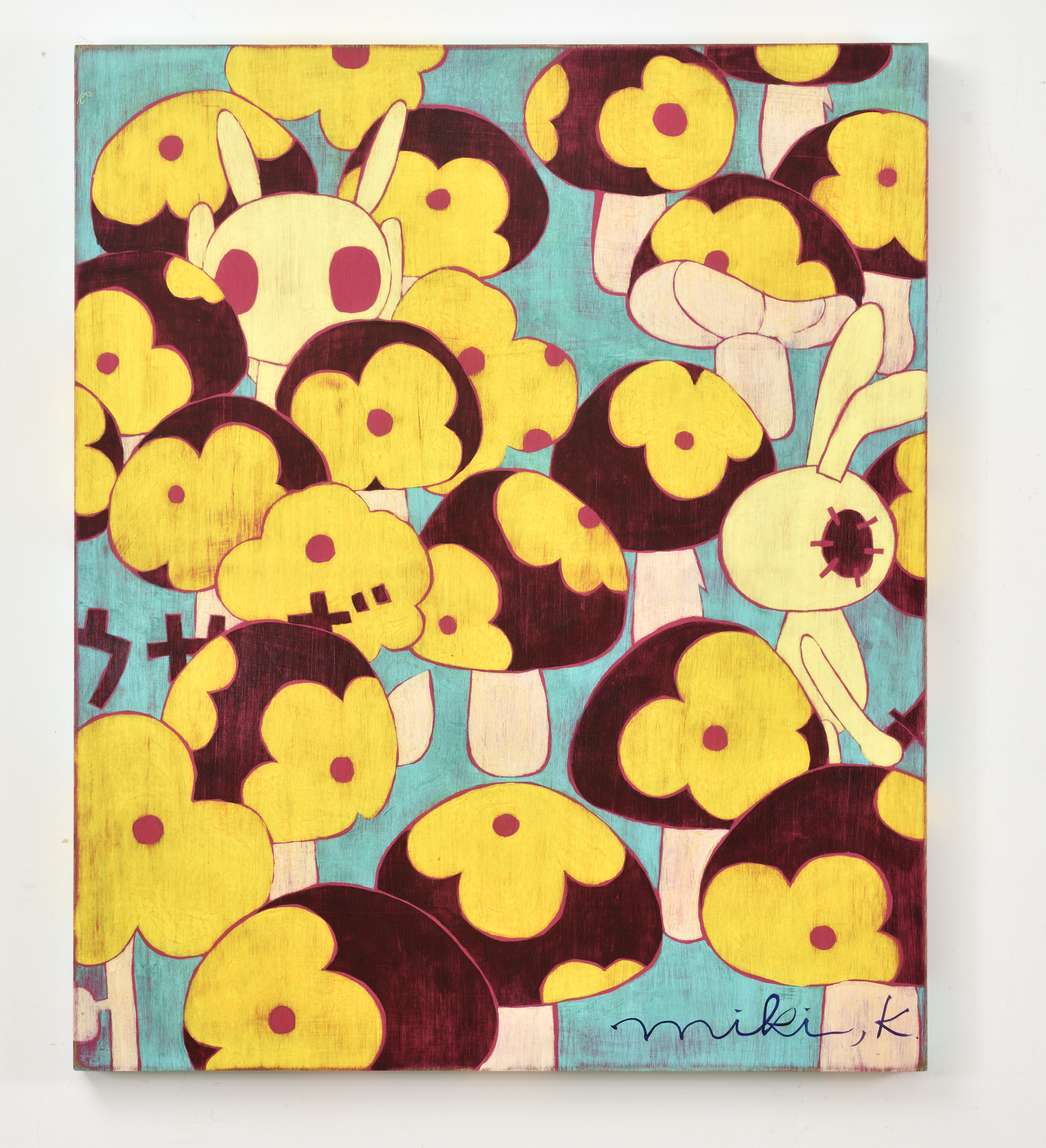 카리야 미키는 일본을 비롯해 뉴욕, 홍콩, 대만 등 국제 미술계에서 주목받는 작가다. 이번 전시는 대표작과 더불어 최근 작업을 아우르며, 그녀의 조형 세계를 깊이 있게 들여다볼 수 있는 소중한 기회를 마련한다. 작품에는 작가가 어린 시절 풀밭에서 느꼈던 경이로움과 막연한 불안, 고립감 같은 감정이 녹아 있다. 작가는 “키 큰 풀 사이에 집이 보이지 않을 때의 불안, 머리 위를 스쳐가는 비행기 소리 같은 순간들이 작업에 영향을 주었다”고 말한다. 그 기억은 토끼, 나비, 버섯, 집과 같은 친숙한 이미지로 변주되며, 환상적이지만 낯설고, 귀엽지만 어딘가 불편한 감각을 자아낸다. 이들 모티프는 ‘카와이(kawaii)’ 미학을 연상시키면서도 생존 본능, 저항, 독성, 권력 구조 등의 복합적 의미를 품고 있다. 순수의 상징인 토끼가 검을 쥔 모습은 생존과 투쟁의 긴장감을 불러일으키고, 비폭력적인 버섯은 은근한 위협을 암시한다. 동화적 외형에 숨겨진 이중성은 강자와 약자, 포식자와 피식자의 경계를 흐리며, 보는 이로 하여금 날카로운 질문과 마주하게 만든다. 작품은 나무 패널 위에 아크릴 물감을 수십 겹 덧입힌 후, 줄톱이나 바늘, 사포 같은 도구로 표면을 긁어내고 갈아내는 방식으로 완성된다. 이 반복적이고 물리적인 과정을 통해 화면에는 시간의 흔적이 고스란히 배어든다. 작가는 새것보다 낡고 거친 질감에 매력을 느낀다고 말하며, 어릴 적 어머니와 함께 자주 들르던 앤티크 숍에서의 경험이 지금의 작업 방식에 큰 영향을 주었다고 회고한다.