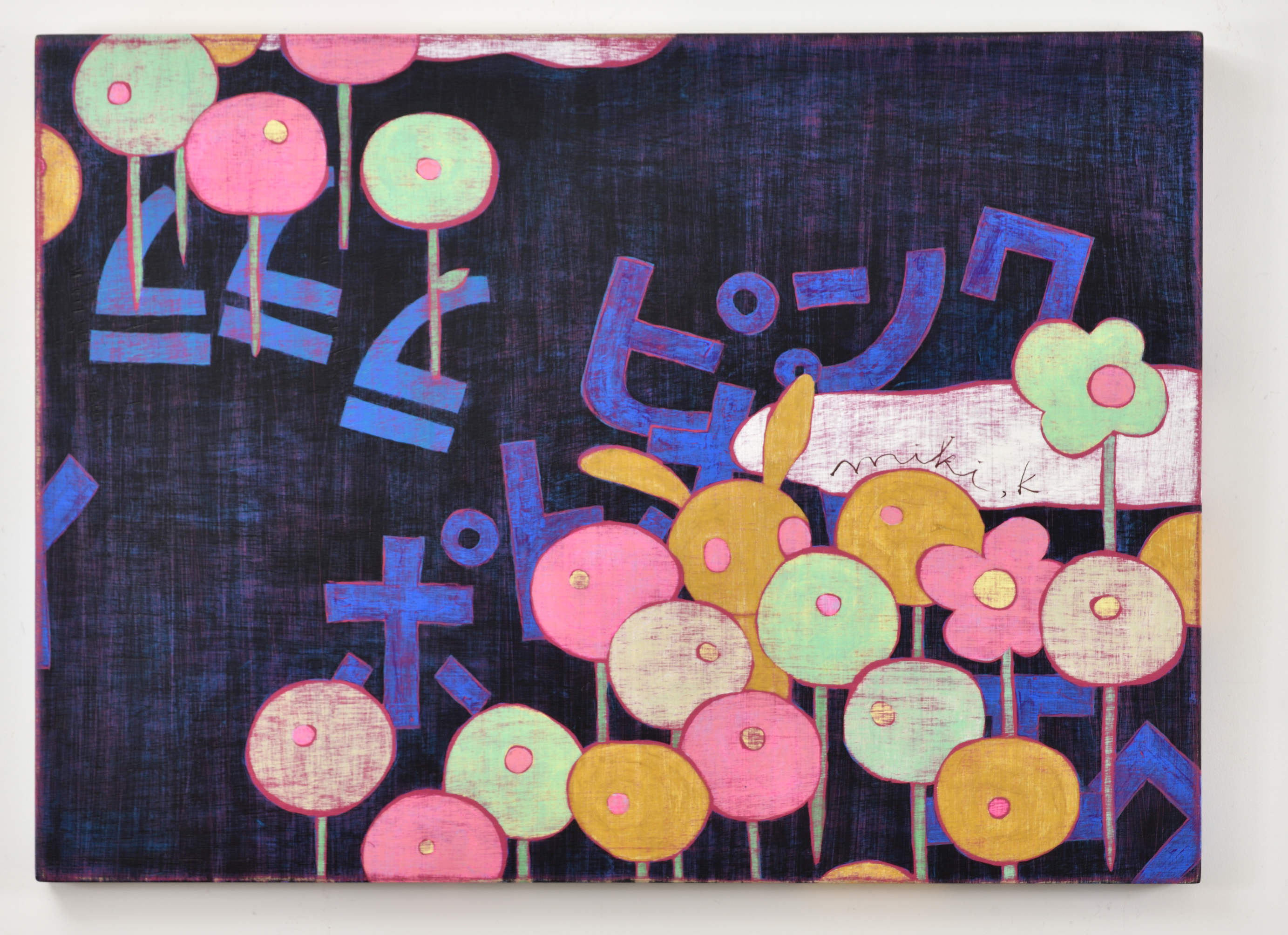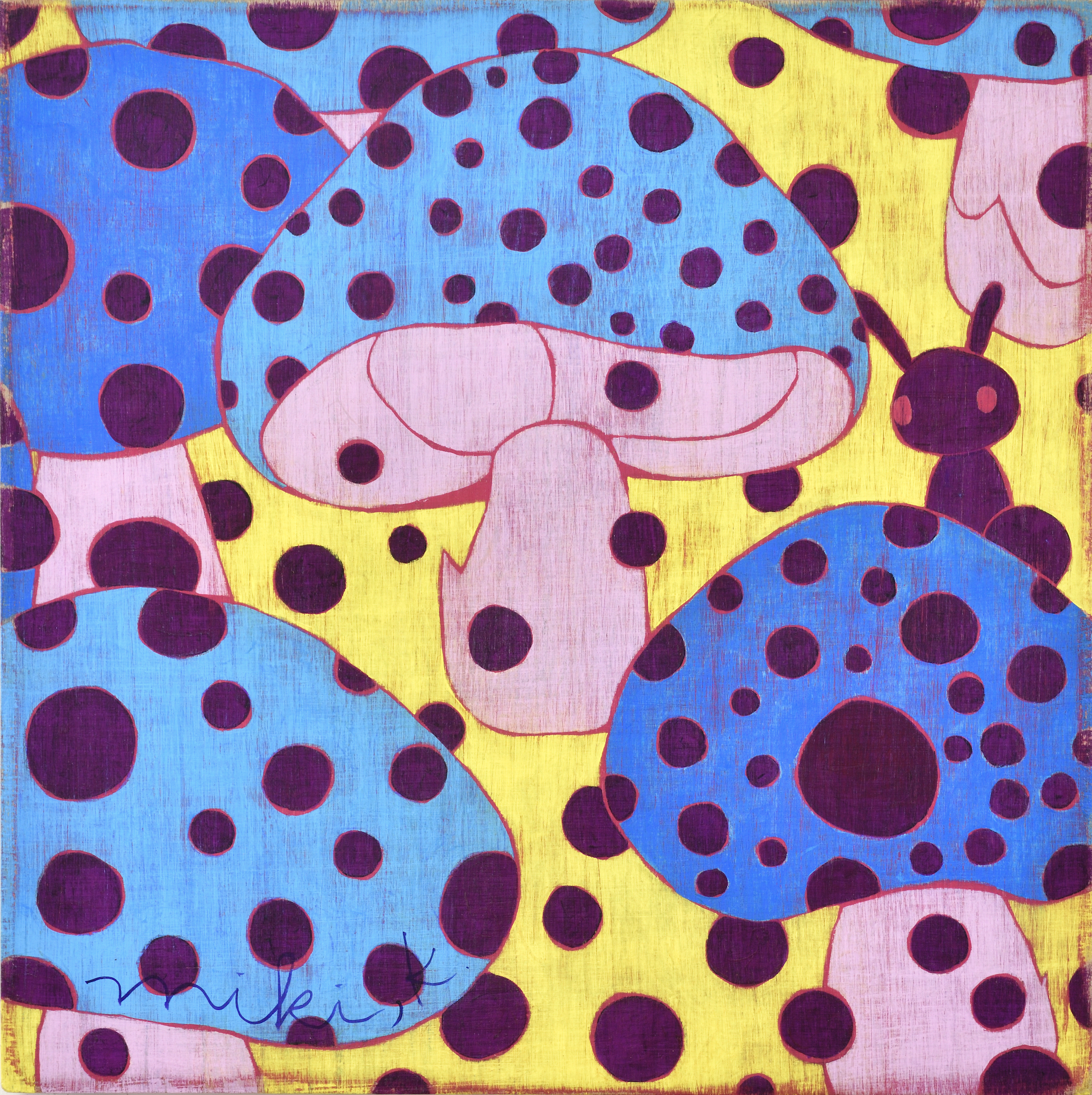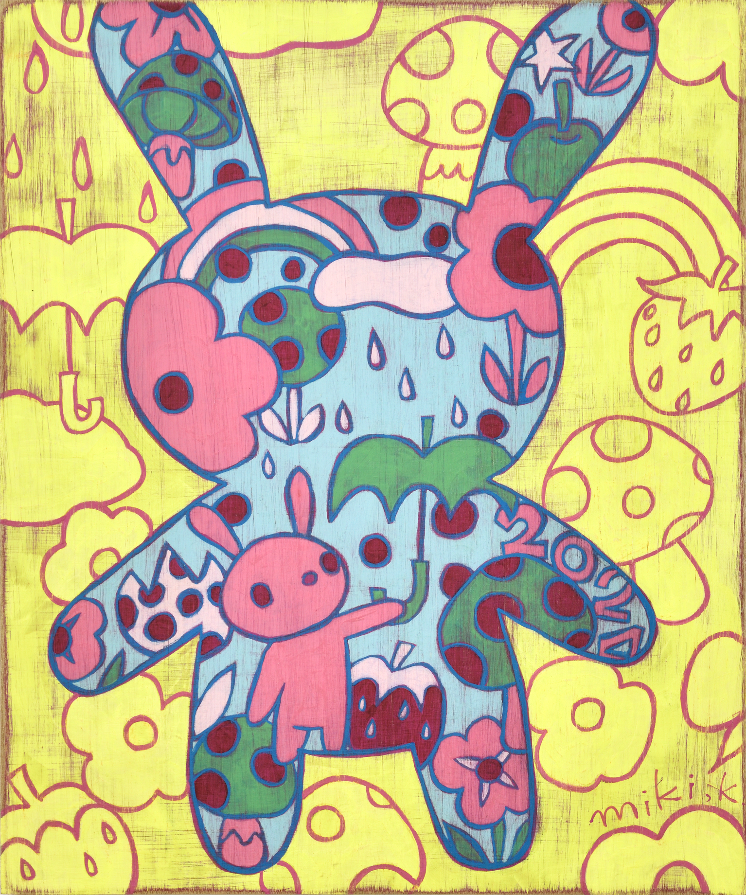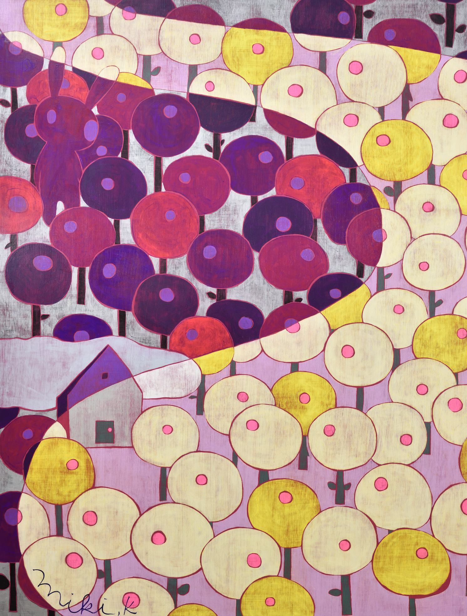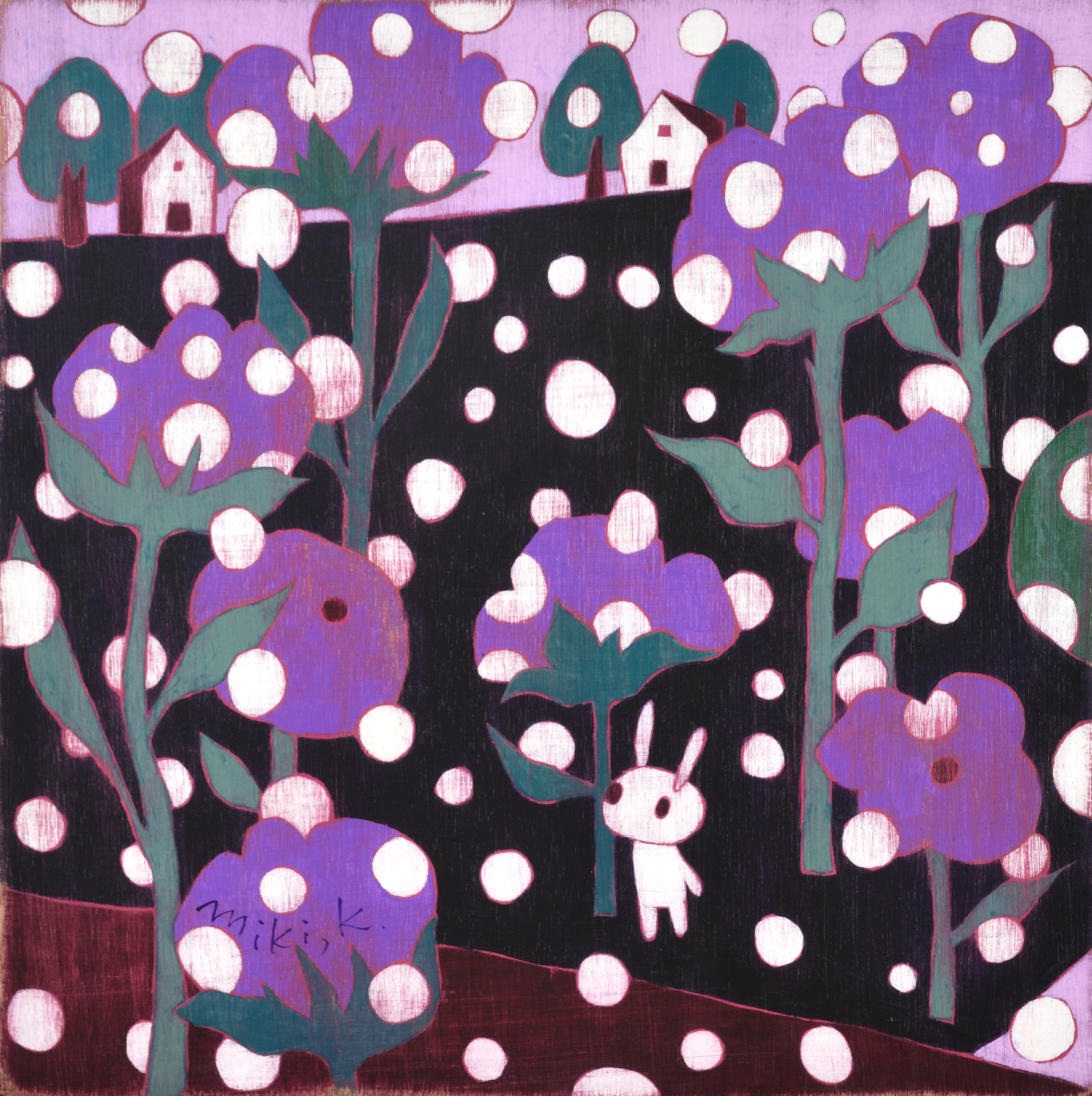 카리야 미키는 일본을 비롯해 뉴욕, 홍콩, 대만 등 국제 미술계에서 주목받는 작가다. 이번 전시는 대표작과 더불어 최근 작업을 아우르며, 그녀의 조형 세계를 깊이 있게 들여다볼 수 있는 소중한 기회를 마련한다. 작품에는 작가가 어린 시절 풀밭에서 느꼈던 경이로움과 막연한 불안, 고립감 같은 감정이 녹아 있다. 작가는 “키 큰 풀 사이에 집이 보이지 않을 때의 불안, 머리 위를 스쳐가는 비행기 소리 같은 순간들이 작업에 영향을 주었다”고 말한다. 그 기억은 토끼, 나비, 버섯, 집과 같은 친숙한 이미지로 변주되며, 환상적이지만 낯설고, 귀엽지만 어딘가 불편한 감각을 자아낸다. 이들 모티프는 ‘카와이(kawaii)’ 미학을 연상시키면서도 생존 본능, 저항, 독성, 권력 구조 등의 복합적 의미를 품고 있다. 순수의 상징인 토끼가 검을 쥔 모습은 생존과 투쟁의 긴장감을 불러일으키고, 비폭력적인 버섯은 은근한 위협을 암시한다. 동화적 외형에 숨겨진 이중성은 강자와 약자, 포식자와 피식자의 경계를 흐리며, 보는 이로 하여금 날카로운 질문과 마주하게 만든다. 작품은 나무 패널 위에 아크릴 물감을 수십 겹 덧입힌 후, 줄톱이나 바늘, 사포 같은 도구로 표면을 긁어내고 갈아내는 방식으로 완성된다. 이 반복적이고 물리적인 과정을 통해 화면에는 시간의 흔적이 고스란히 배어든다. 작가는 새것보다 낡고 거친 질감에 매력을 느낀다고 말하며, 어릴 적 어머니와 함께 자주 들르던 앤티크 숍에서의 경험이 지금의 작업 방식에 큰 영향을 주었다고 회고한다.
