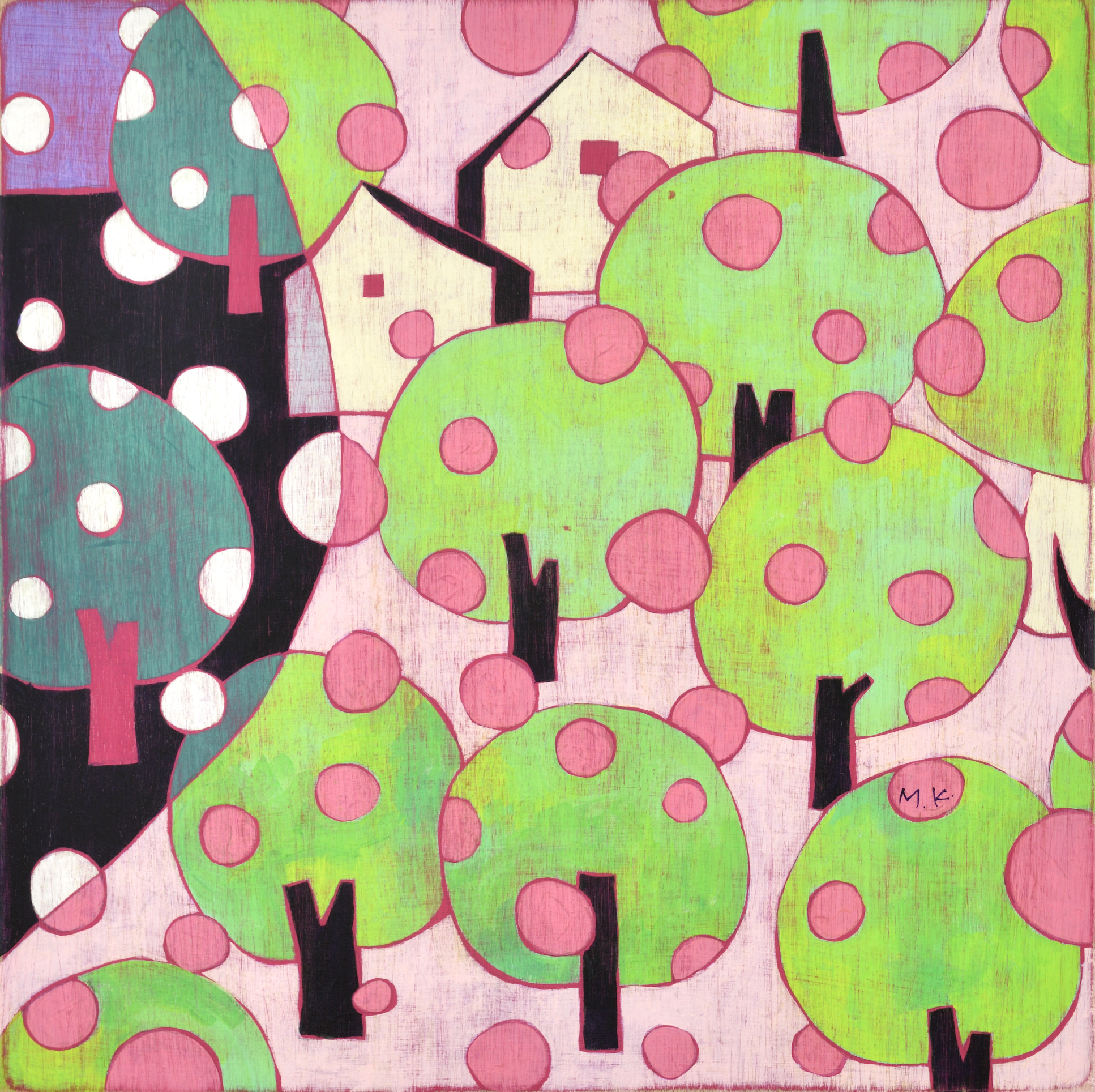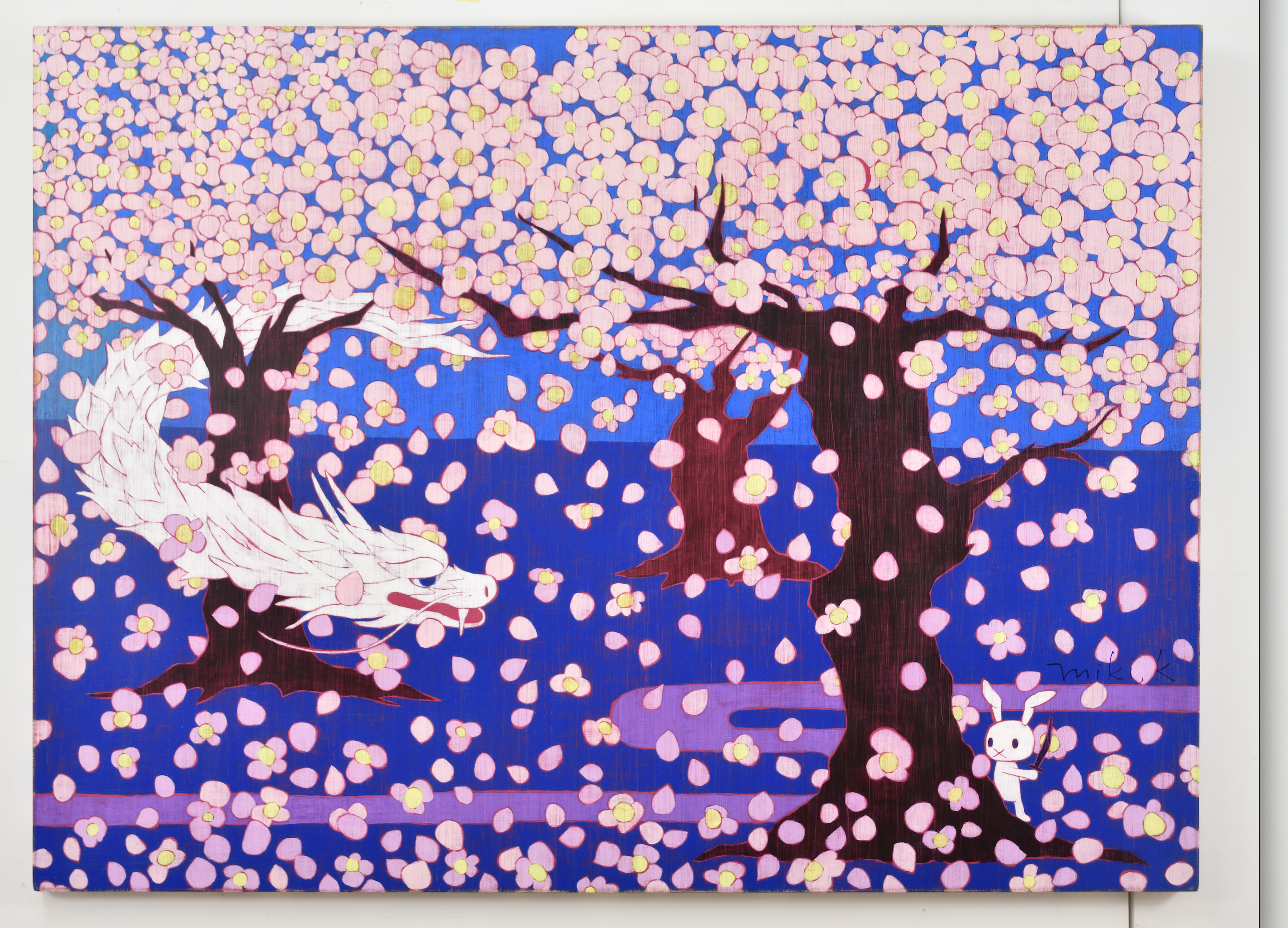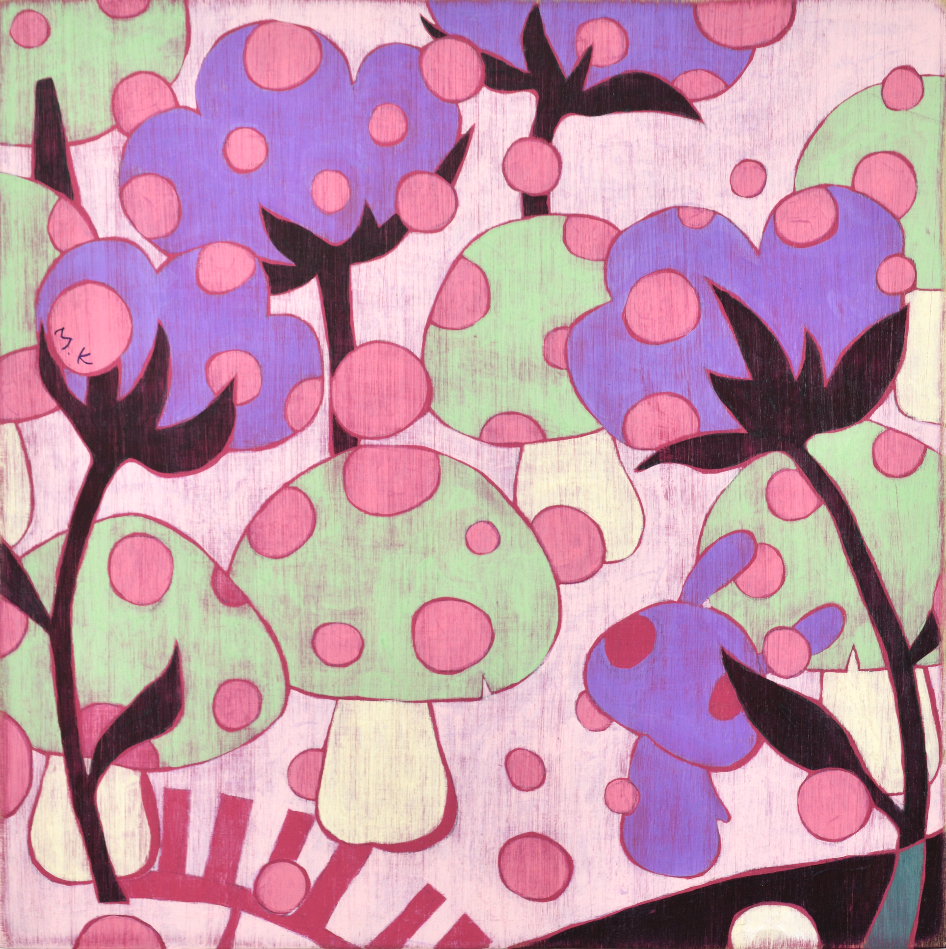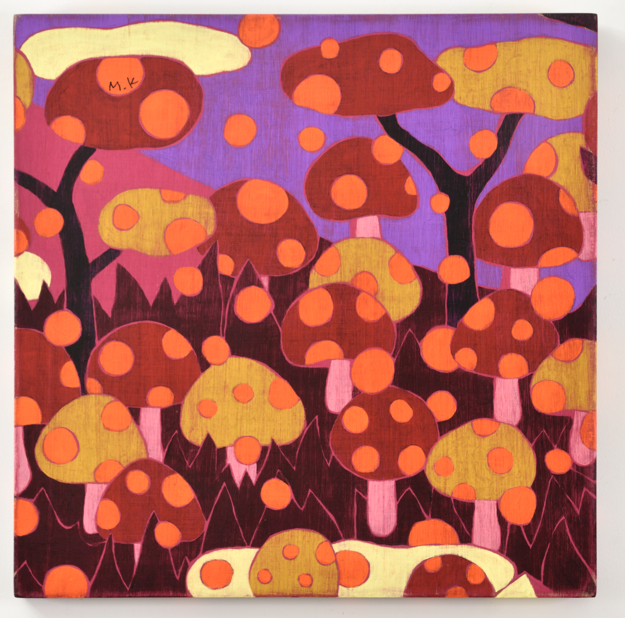 카리야 미키는 일본을 비롯해 뉴욕, 홍콩, 대만 등 국제 미술계에서 주목받는 작가다. 이번 전시는 대표작과 더불어 최근 작업을 아우르며, 그녀의 조형 세계를 깊이 있게 들여다볼 수 있는 소중한 기회를 마련한다. 작품에는 작가가 어린 시절 풀밭에서 느꼈던 경이로움과 막연한 불안, 고립감 같은 감정이 녹아 있다. 작가는 “키 큰 풀 사이에 집이 보이지 않을 때의 불안, 머리 위를 스쳐가는 비행기 소리 같은 순간들이 작업에 영향을 주었다”고 말한다. 그 기억은 토끼, 나비, 버섯, 집과 같은 친숙한 이미지로 변주되며, 환상적이지만 낯설고, 귀엽지만 어딘가 불편한 감각을 자아낸다. 이들 모티프는 ‘카와이(kawaii)’ 미학을 연상시키면서도 생존 본능, 저항, 독성, 권력 구조 등의 복합적 의미를 품고 있다. 순수의 상징인 토끼가 검을 쥔 모습은 생존과 투쟁의 긴장감을 불러일으키고, 비폭력적인 버섯은 은근한 위협을 암시한다. 동화적 외형에 숨겨진 이중성은 강자와 약자, 포식자와 피식자의 경계를 흐리며, 보는 이로 하여금 날카로운 질문과 마주하게 만든다. 작품은 나무 패널 위에 아크릴 물감을 수십 겹 덧입힌 후, 줄톱이나 바늘, 사포 같은 도구로 표면을 긁어내고 갈아내는 방식으로 완성된다. 이 반복적이고 물리적인 과정을 통해 화면에는 시간의 흔적이 고스란히 배어든다. 작가는 새것보다 낡고 거친 질감에 매력을 느낀다고 말하며, 어릴 적 어머니와 함께 자주 들르던 앤티크 숍에서의 경험이 지금의 작업 방식에 큰 영향을 주었다고 회고한다.
