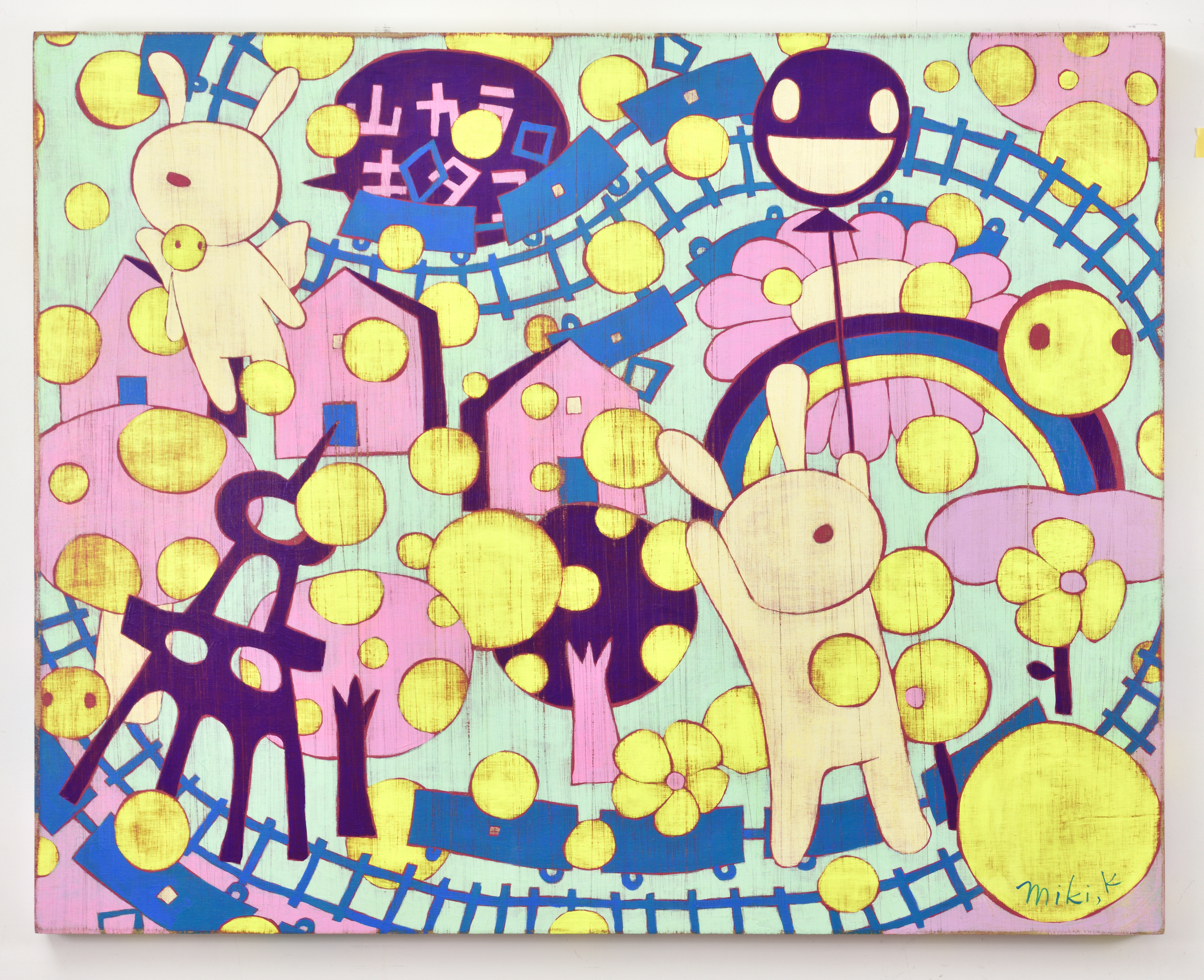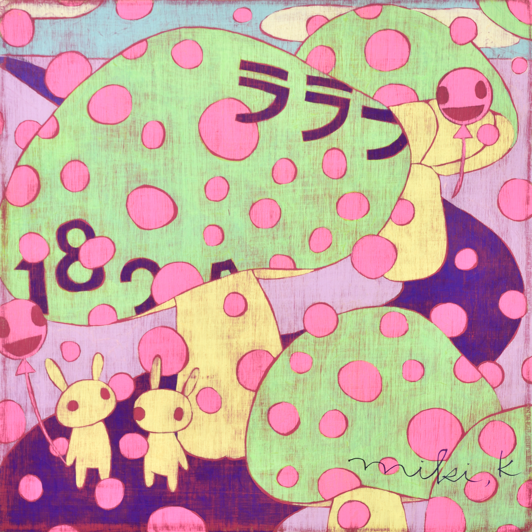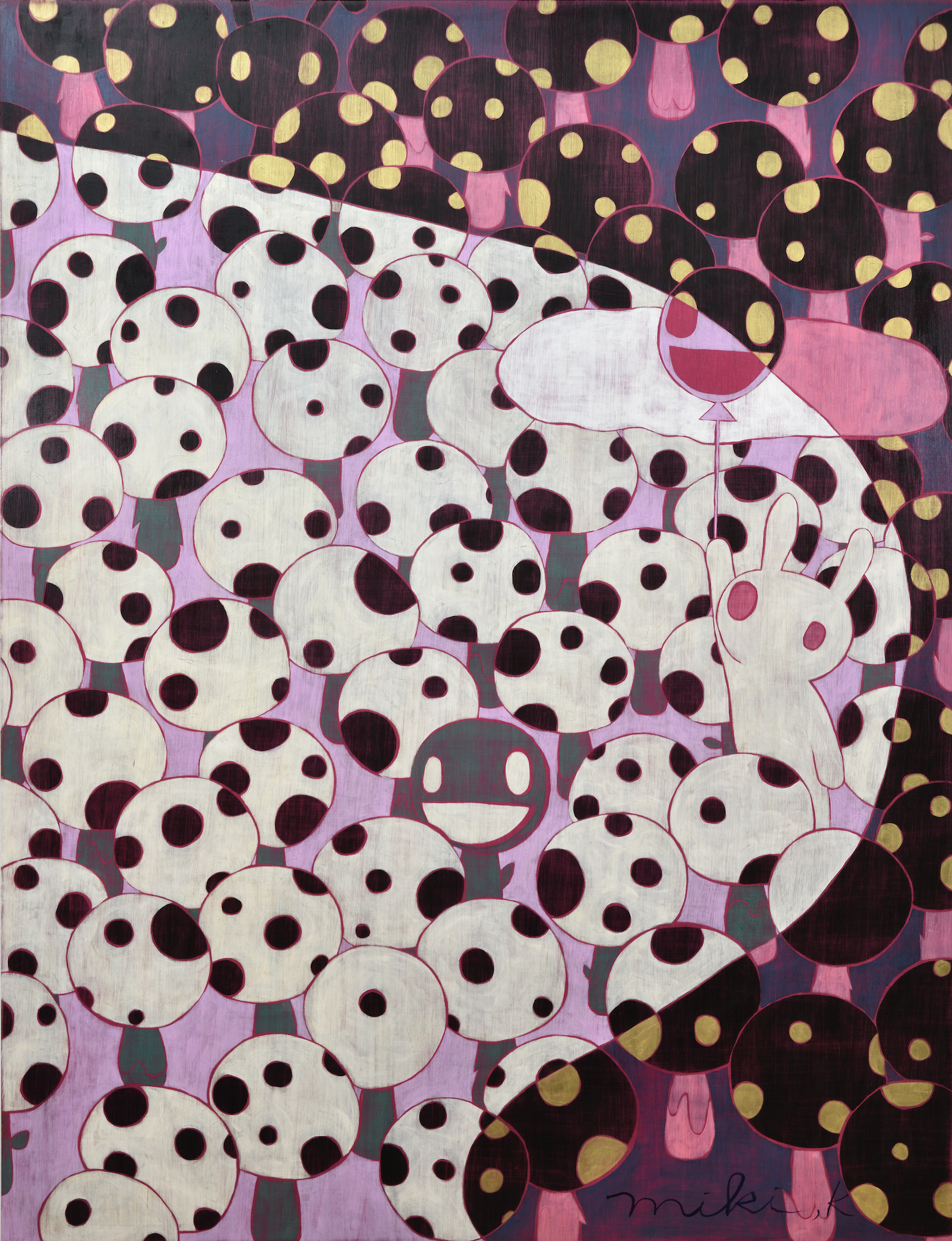 카리야 미키는 경이로움, 고립감, 그리고 막연한 불안과 같은 어린 시절의 기억을 바탕으로 환상적이면서도 낯익은 이미지들을 창조해낸다. “어릴 때는 동네 풀밭에서 곤충을 잡곤 했어요. 키 큰 풀 사이에서 집이 보이지 않을 때 느꼈던 불안감, 머리 위를 지나가는 비행기 소리 같은 순간들이 지금의 작업에 영향을 준 것 같습니다.” 라는 작가의 말처럼, 어린 시절의 섬세한 감정이 작품 곳곳에 살아 숨쉰다. 토끼, 버섯, 나비, 집과 같은 친근한 모티프들은 일본 대중문화의 ‘카와이(kawaii)’ 미학을 떠올리게 하지만, 그 안에는 권력 관계, 생존 본능, 저항, 독성 등 복합적 의미가 숨어 있다.
