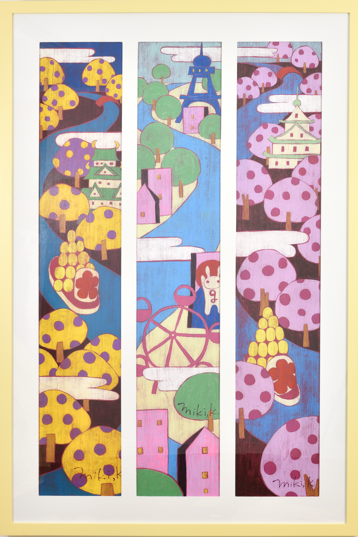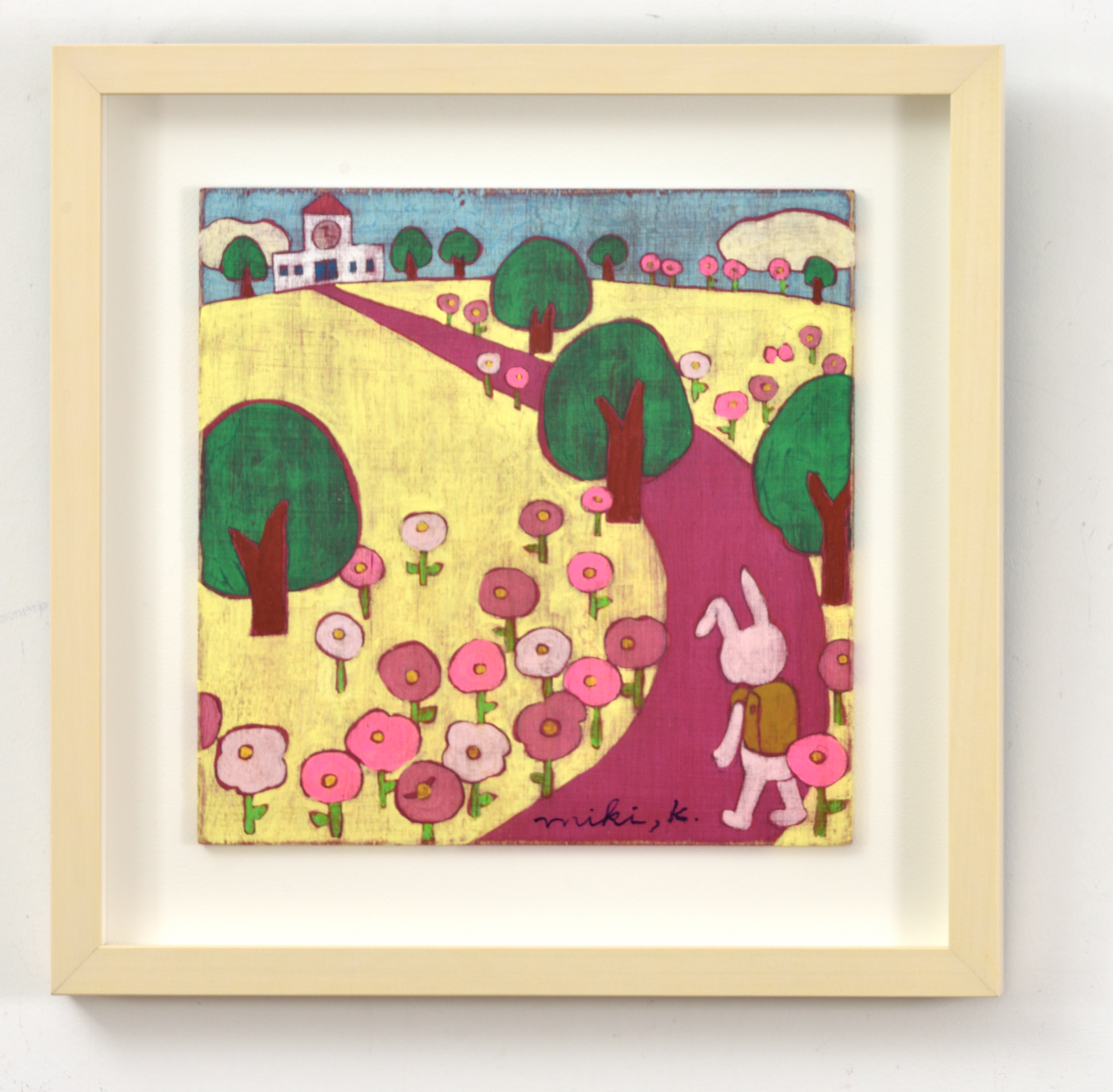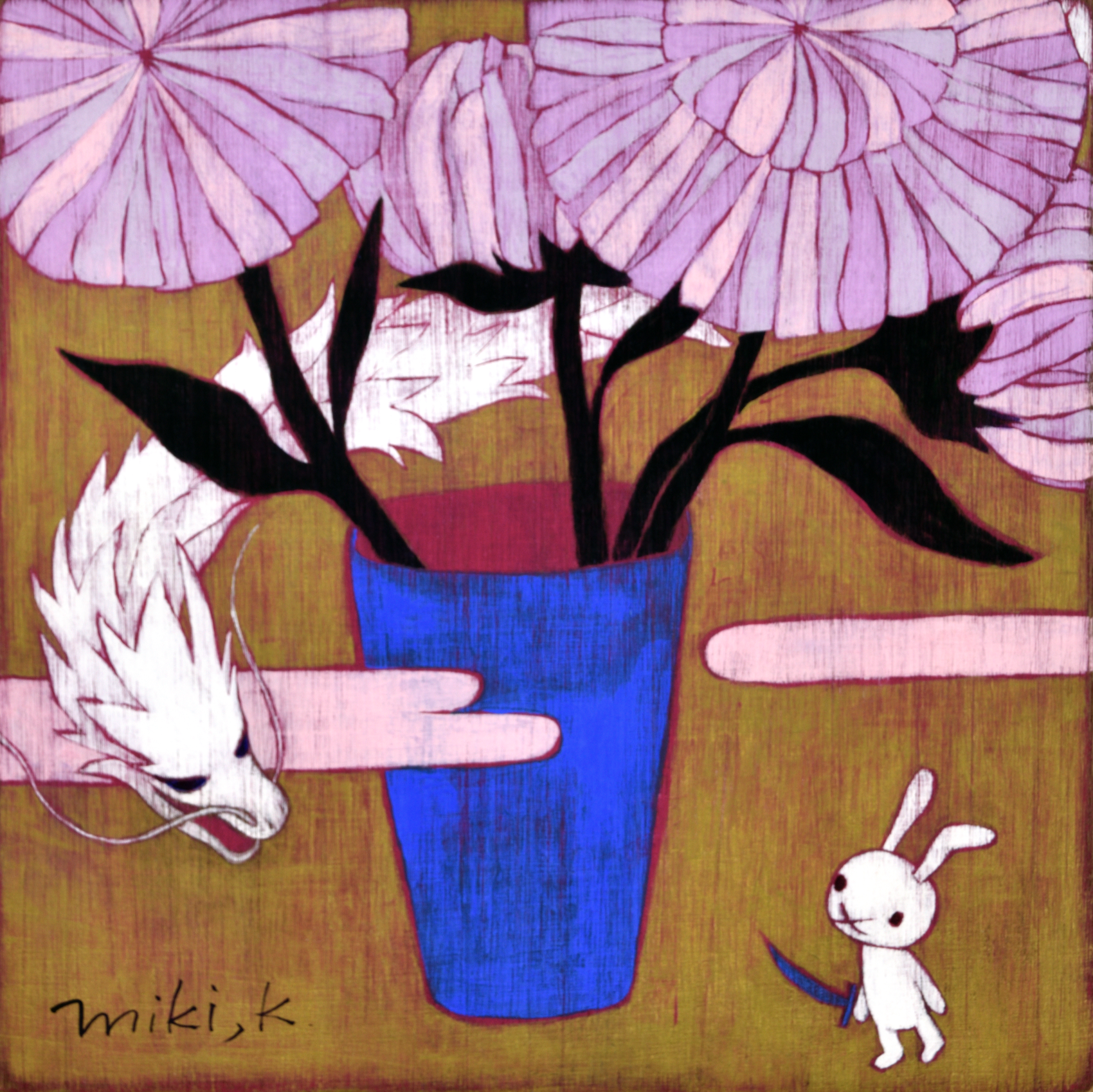 카리야 미키는 경이로움, 고립감, 그리고 막연한 불안과 같은 어린 시절의 기억을 바탕으로 환상적이면서도 낯익은 이미지들을 창조해낸다. “어릴 때는 동네 풀밭에서 곤충을 잡곤 했어요. 키 큰 풀 사이에서 집이 보이지 않을 때 느꼈던 불안감, 머리 위를 지나가는 비행기 소리 같은 순간들이 지금의 작업에 영향을 준 것 같습니다.” 라는 작가의 말처럼, 어린 시절의 섬세한 감정이 작품 곳곳에 살아 숨쉰다. 토끼, 버섯, 나비, 집과 같은 친근한 모티프들은 일본 대중문화의 ‘카와이(kawaii)’ 미학을 떠올리게 하지만, 그 안에는 권력 관계, 생존 본능, 저항, 독성 등 복합적 의미가 숨어 있다.
