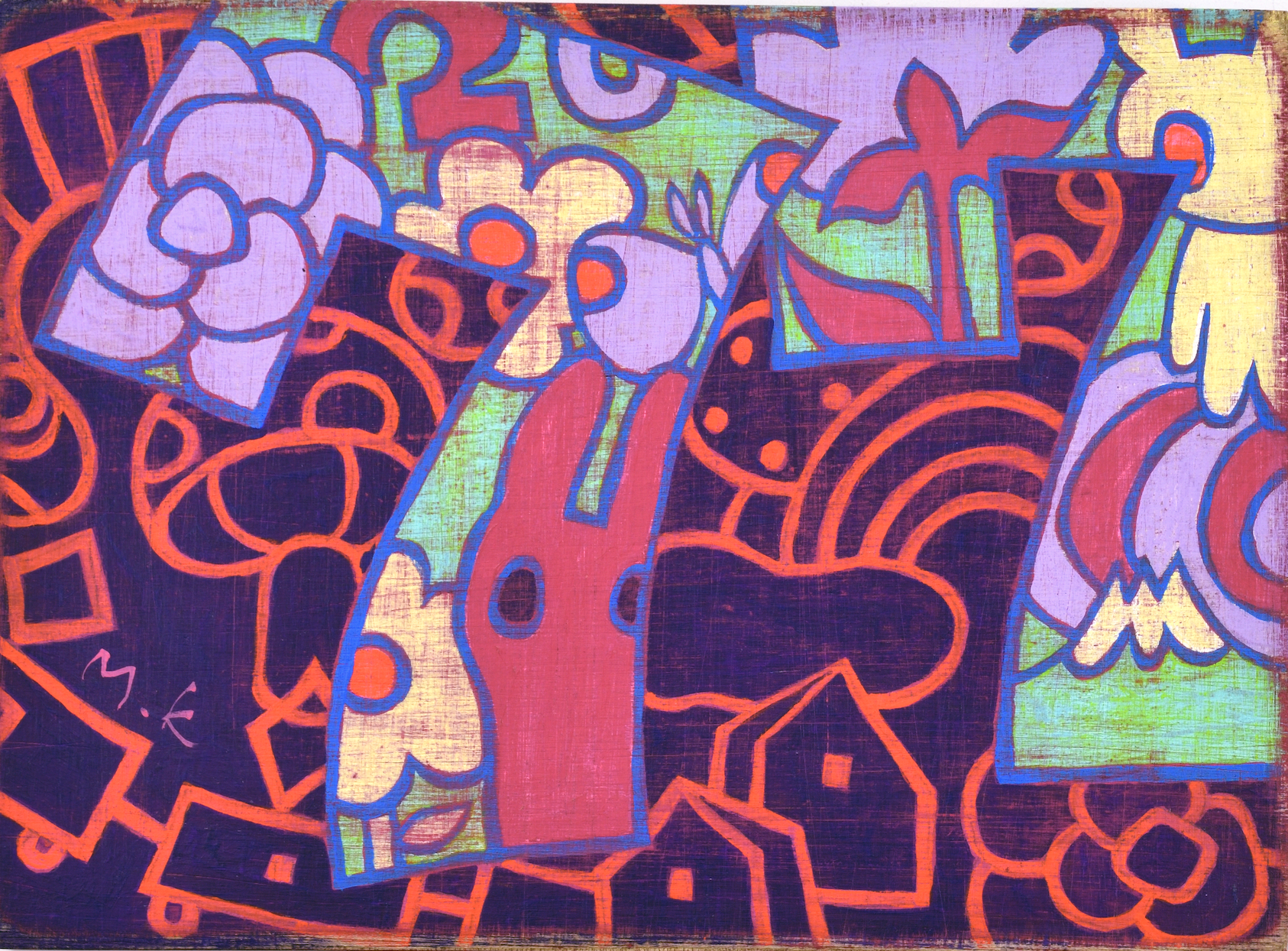 카리야는 나무 패널을 사용하여 작품을 제작한다. 짙은 붉은색 등으로 밑작업을 하고 그 위에 아크릴 물감을 수십 겹 덧칠하여 줄톱, 바늘, 파일, 사포 등의 도구로 반복적으로 긁고 갈아내는 방식으로 화면을 구성한다. 이러한 마모와 축적의 과정은 마치 오래된 신사나 사찰의 문, 천장처럼 시간의 흔적이 스며든 독특한 질감을 만들어낸다. “저는 새것보다는 낡고 거친 질감을 좋아해요.” 라는 그녀의 취향은 어린 시절 어머니와 함께 자주 방문했던 앤티크 숍에서 시작되었다. 오래된 물건을 손으로 만지고 관찰하며 시간이 빚어낸 고유의 아름다움을 발견한 경험이, 현재 작업의 핵심적인 미학으로 자리 잡았다. 이러한 작업 방식은 단순한 시각적 효과를 넘어서, 작가가 유년기 풀밭 속에서 느꼈던 낯섦과 긴장, 흘러가는 시간에 대한 감각을 회화 속에 응축시키는 장치로 기능한다.